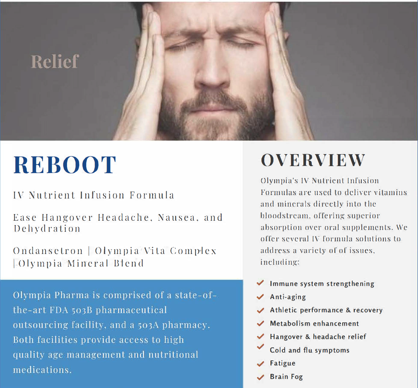Need to reboot after a fun night out? This rehydrating infusion can help with the hangover headache, nausea, & dehydration. Add on boosters available.
